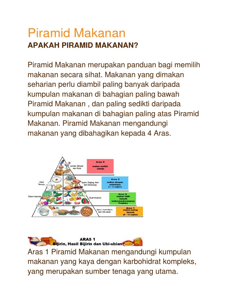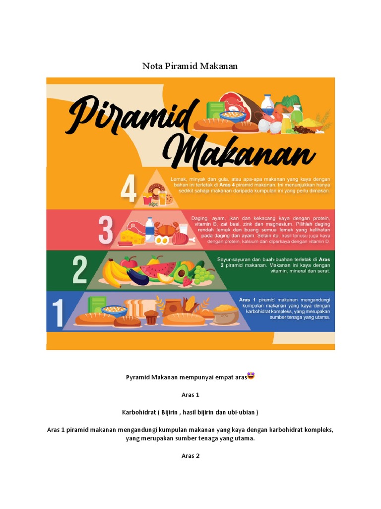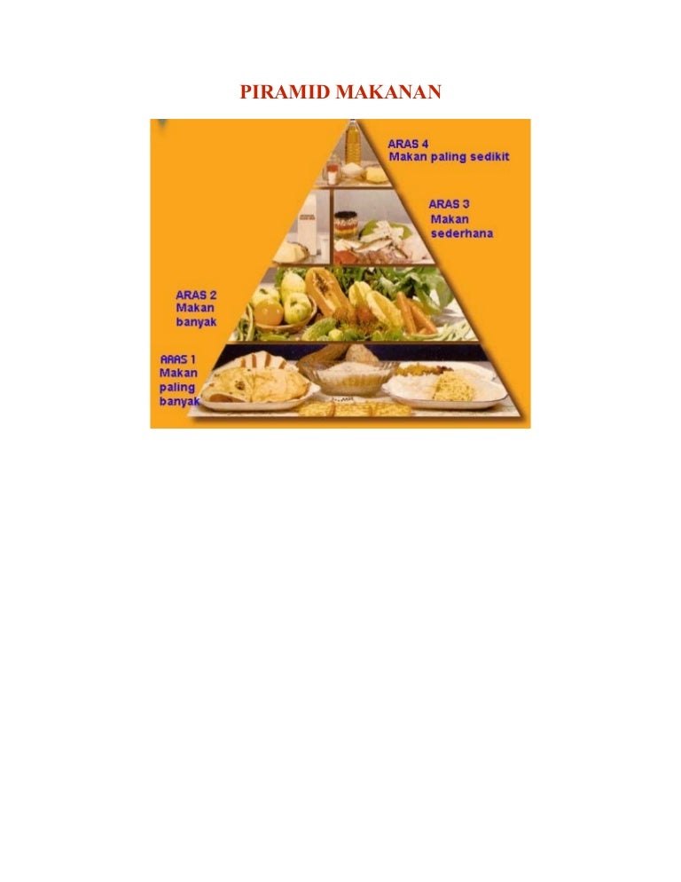 Contoh karangan ulasan piramid makanan bahasa melayu tentang pemakanan seimbang terbaik untuk isi tersirat, tersurat & kesimpulan. Aras 1 piramid makanan mengandungi kumpulan makanan yang kaya dengan karbohidrat kompleks yang merupakan sumber tenaga yang utama. Aras 1 merupakan kumpulan makanan karbohidrat yang berfungsi untuk membekalkan vitamin, mineral, fiber dan. Aras 1 piramid makanan mengandungi kumpulan makanan yang kaya dengan karbohidrat kompleks, yang merupakan sumber tenaga yang utama. Aras yang paling bawah mewakili makanan.