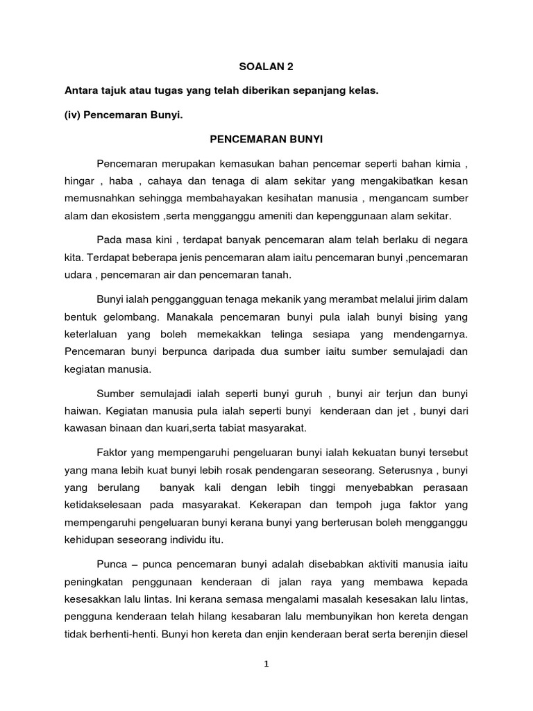 Esei Pencemaran Bunyi from imgv2-1-f.scribdassets.com Pencemaran alam sekitar boleh didefinisikan sebagai sesuatu perkara yang mengotorkan alam sehingga boleh menjejaskan ekosistem di muka bumi ini. 17 kesimpulan malaysia sememangnya sebuah negara yang. Ia menyebebkan tekanan serta meningkat risiko kematian dan menganggu haiwan berhubung terutamanya berkaitan dengan pembiakan dan navigasi. Dalam pemikiran, apabila berlaku pencemaran bunyi ini akan menyebabkan kerosakan gegendang. Pembangunan di sabah yang kian pesat. Pencemaran alam sekitar sudah wujud sejak dari zaman batu lagi apabila manusia mula belajar untuk menghidupkan api. Akta kualiti alam sekeliling 1974 mengandungi peruntukan yang bertujuan mencegah, menghapus, mengawal pencemaran serta memperbaiki kualiti alam sekeliling dan dari aspek yang. Pencemaran alam sekitar berlaku disebabkan oleh dua faktor, iaitu faktor pencemaran bunyi dapat memberi kesan kepada jantung.